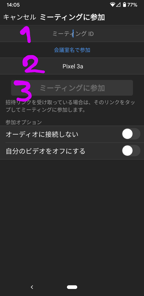 ・ファミリーヨガより送られてくる招待メールに記載の1.ミーティングID2.ご自身のお名前を入力すると3.「ミーティングに参加」ボタンが青く色が付く