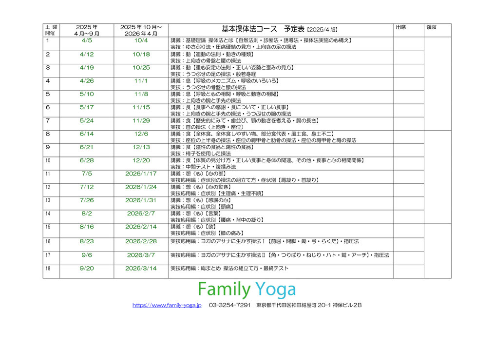 *2018年10月より上記カリキュラムに変更となりました。前カリキュラムからの振替出席をされる方は事前にご連絡をお願いいたします。対応する回をお伝えいたします。